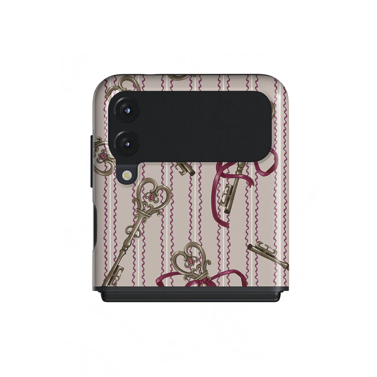 Este design contém: chaves antigas, laços, fitas cor-de-rosa, fundo às riscas
