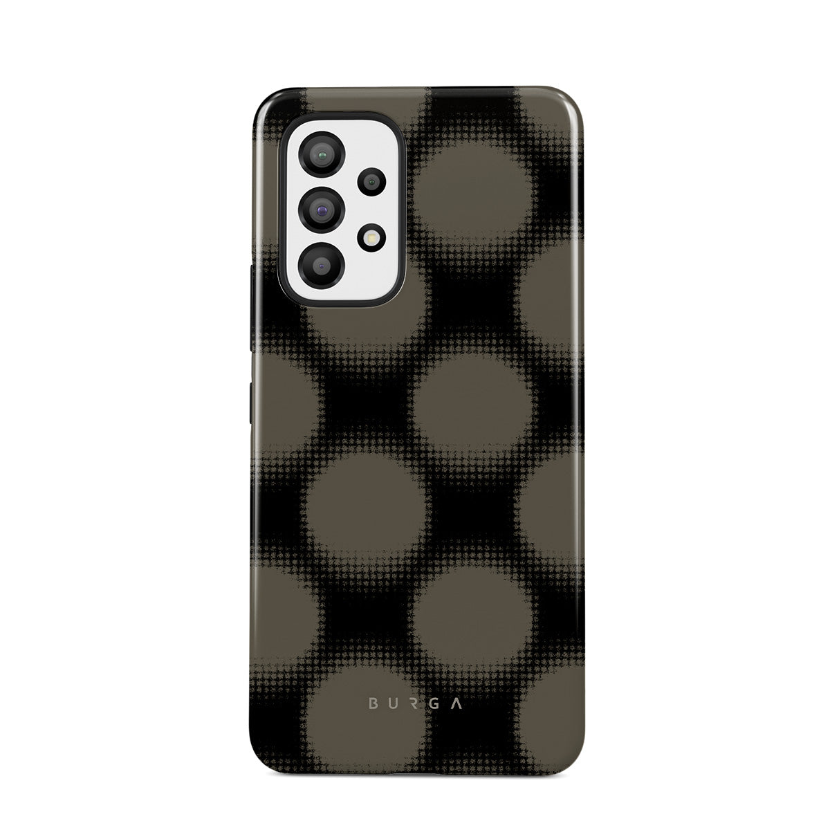 Este design contém: pontos bege, fundo preto, padrão geométrico, desfocado