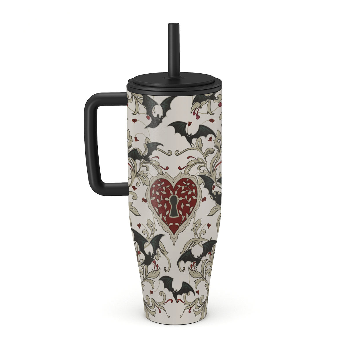 Este design contém: coração, cadeado, morcegos, motivos góticos