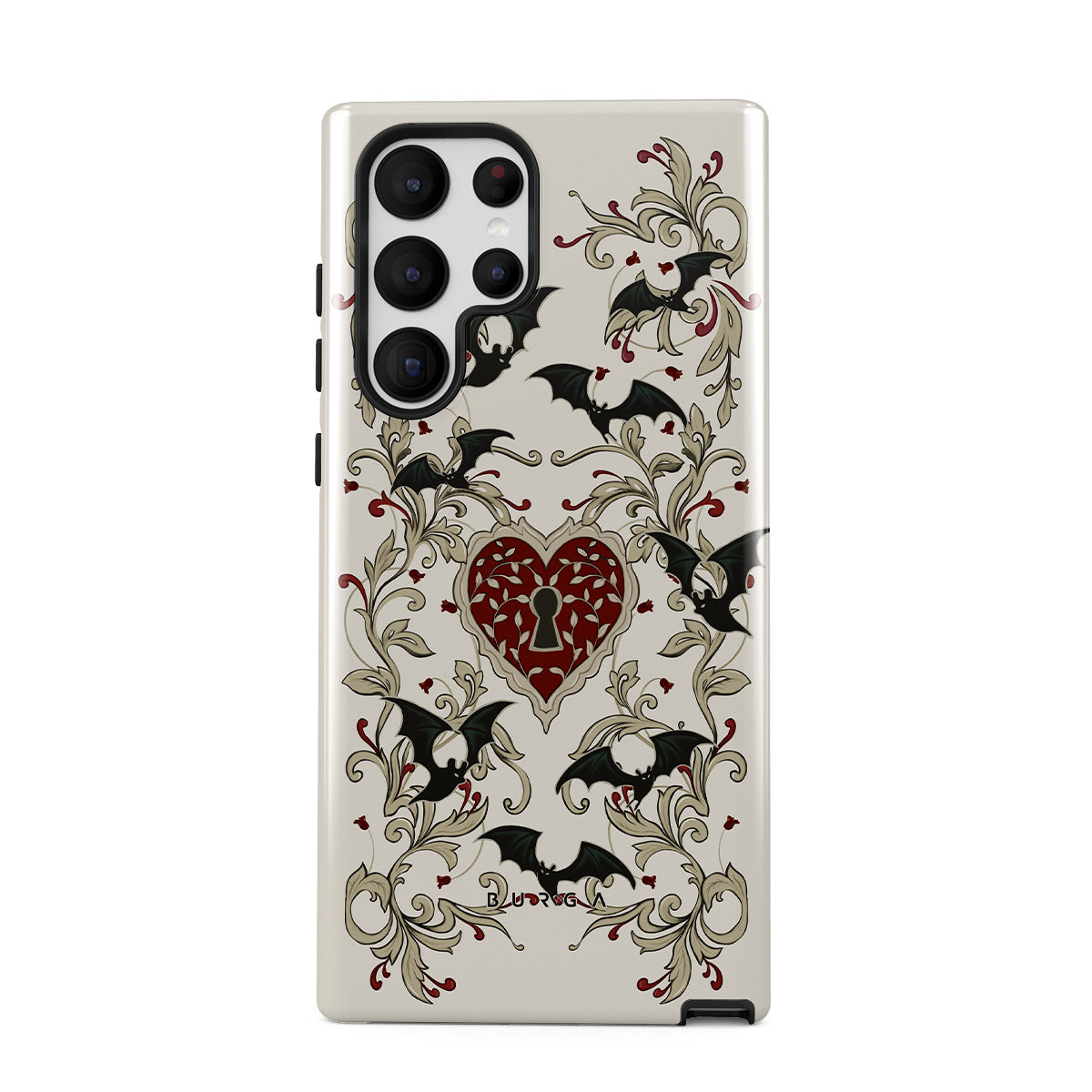 Este design contém: coração, cadeado, morcegos, motivos góticos