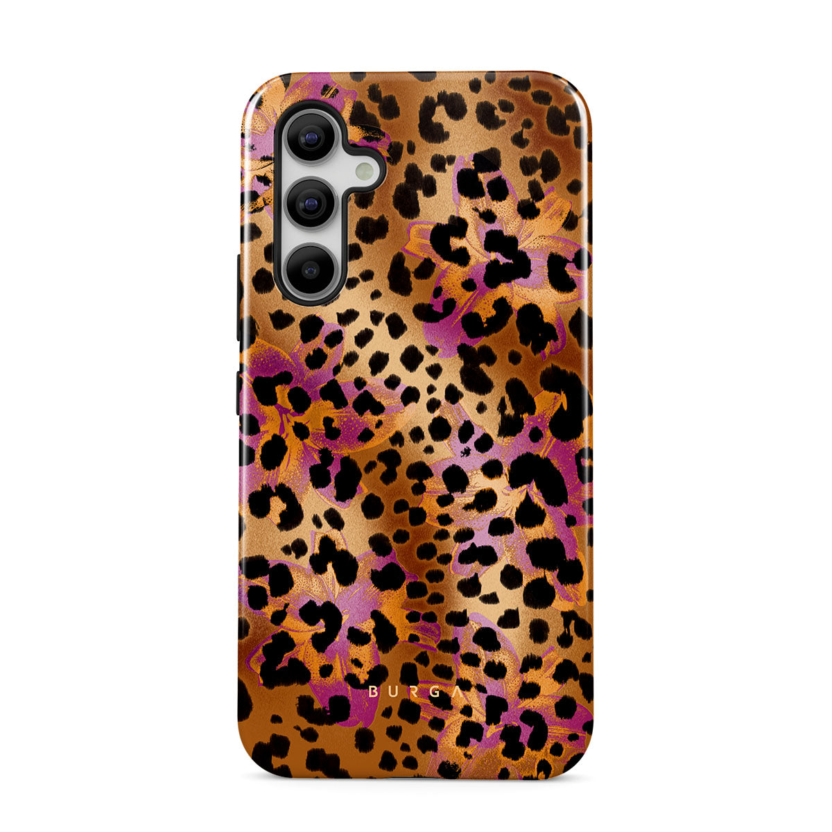 Este design contém: estampa de leopardo, marrom, laranja, roxo, estampa de animal.
