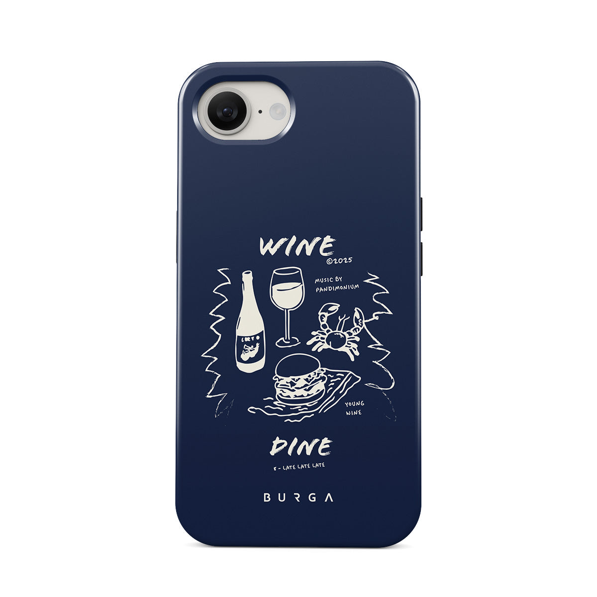 Este design contém: copos de vinho, comida, jantar, ilustrações minimalistas, texto