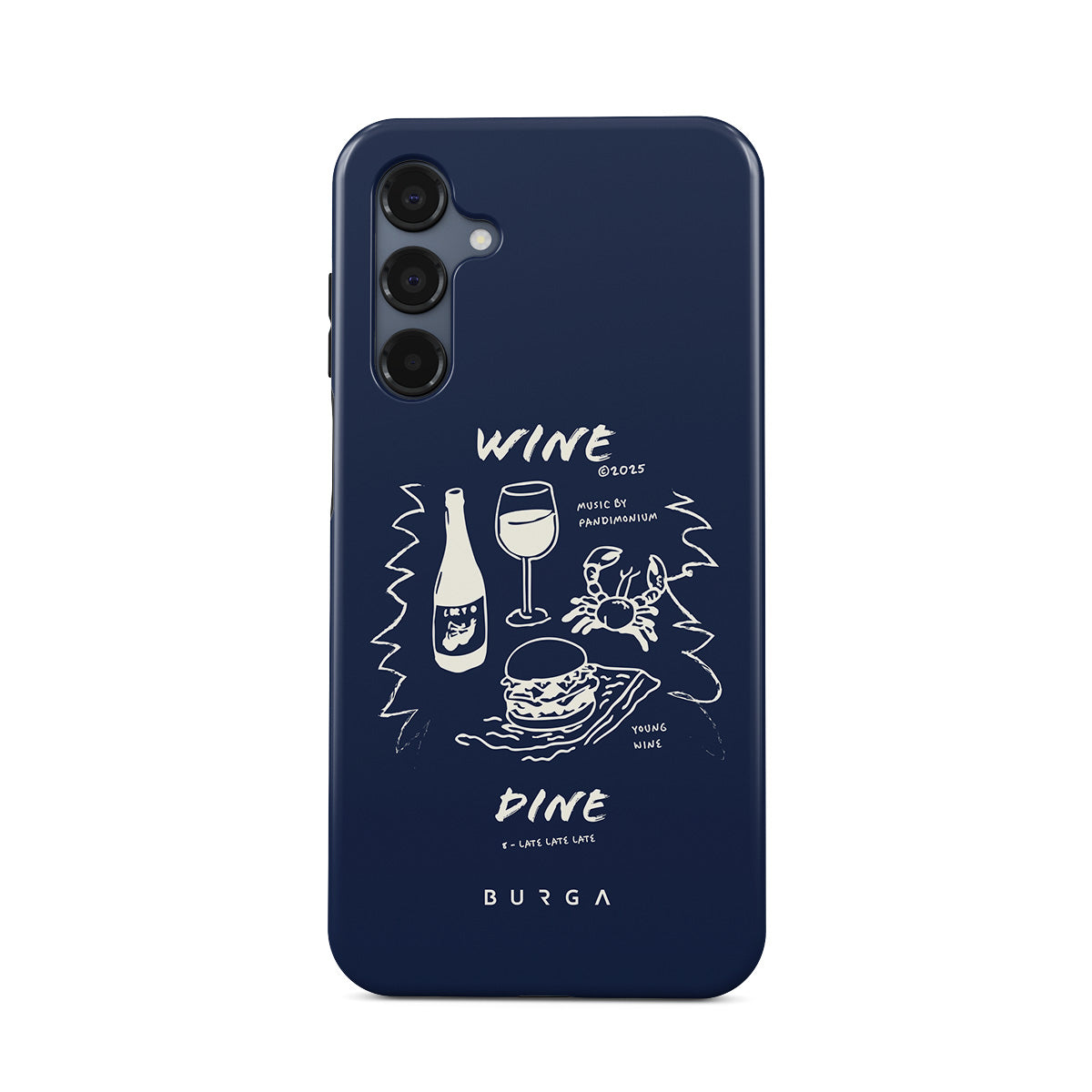 Este design contém: copos de vinho, comida, jantar, ilustrações minimalistas, texto