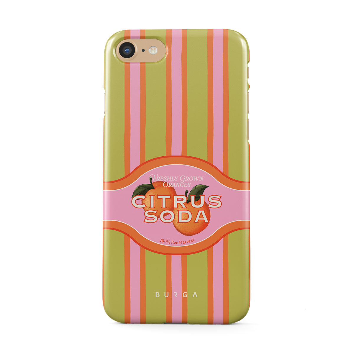 Este design contém: listras de citrinos vibrantes, texto, plantas cítricas, tangerinas, toranjas