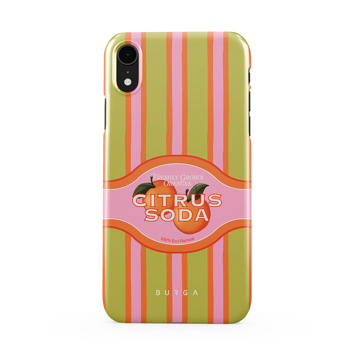 Este design contém: listras de citrinos vibrantes, texto, plantas cítricas, tangerinas, toranjas