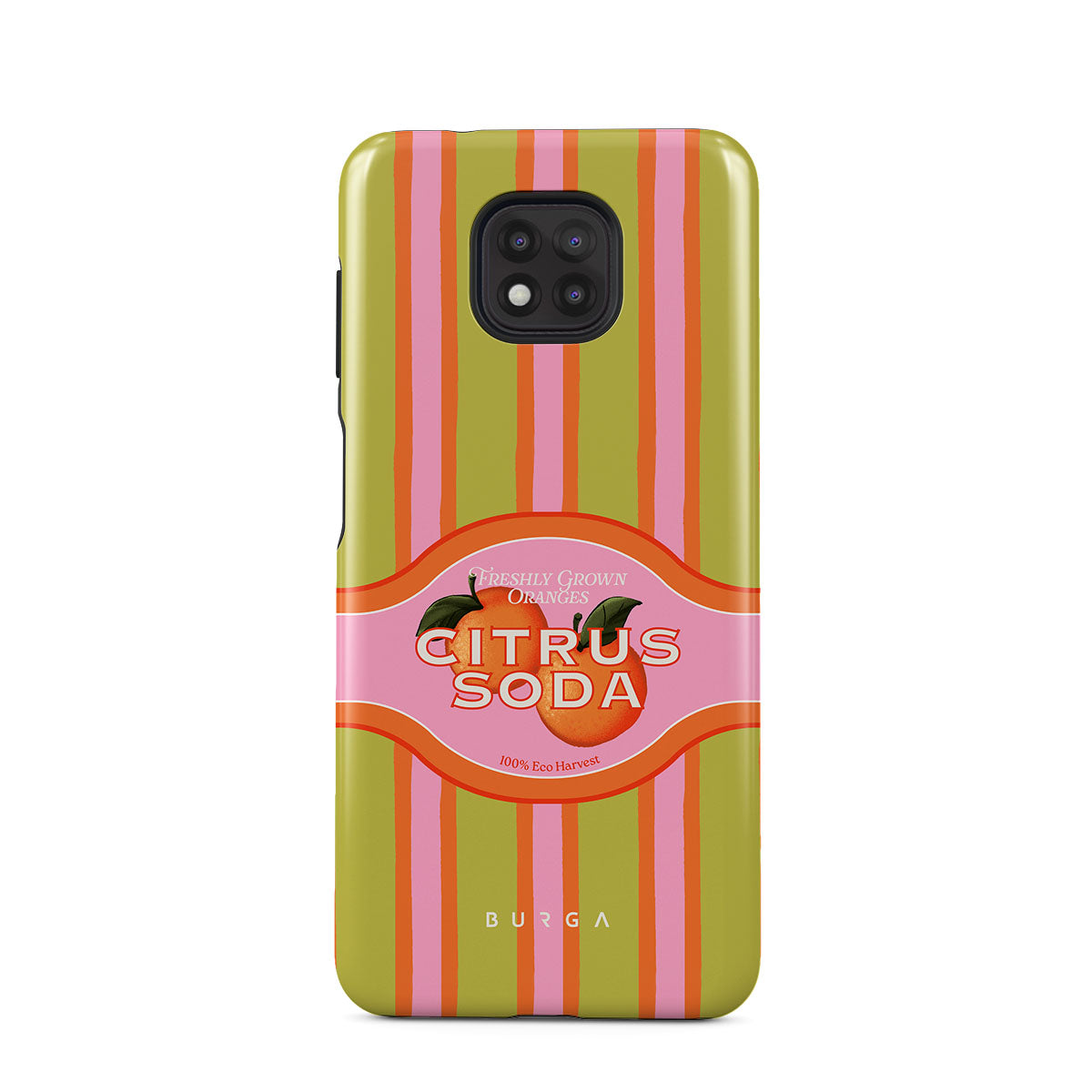 Este design contém: listras de citrinos vibrantes, texto, plantas cítricas, tangerinas, toranjas