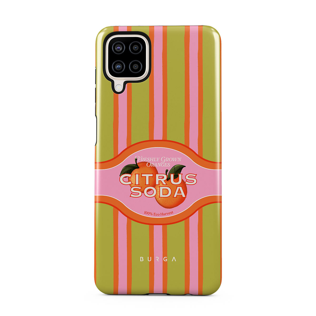 Este design contém: listras de citrinos vibrantes, texto, plantas cítricas, tangerinas, toranjas