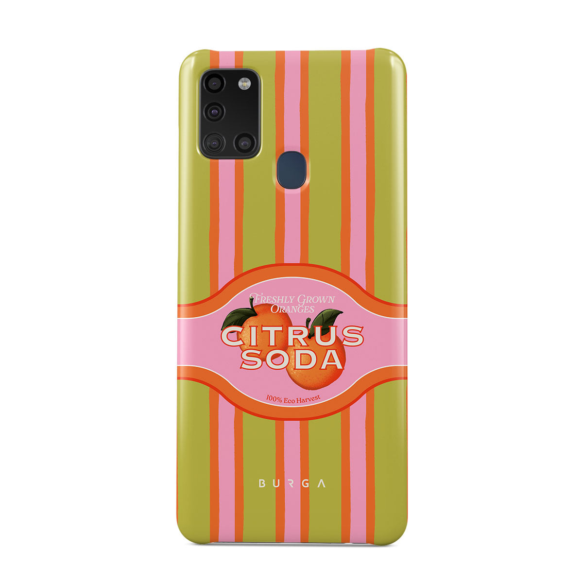 Este design contém: listras de citrinos vibrantes, texto, plantas cítricas, tangerinas, toranjas