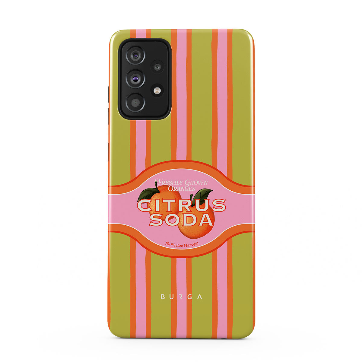 Este design contém: listras de citrinos vibrantes, texto, plantas cítricas, tangerinas, toranjas