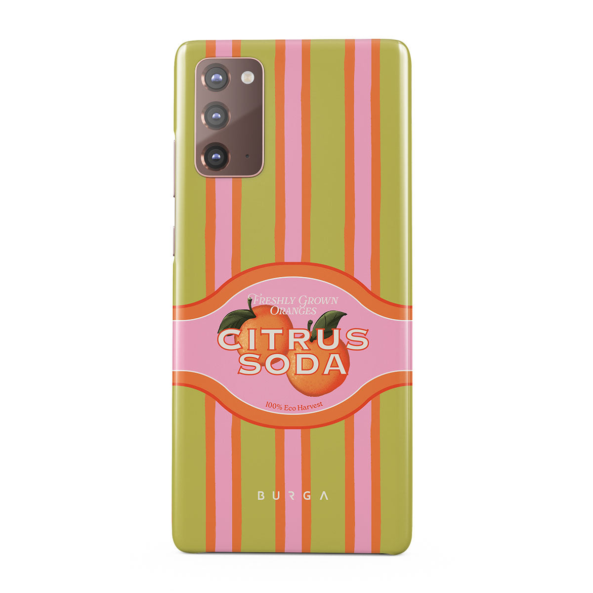 Este design contém: listras de citrinos vibrantes, texto, plantas cítricas, tangerinas, toranjas