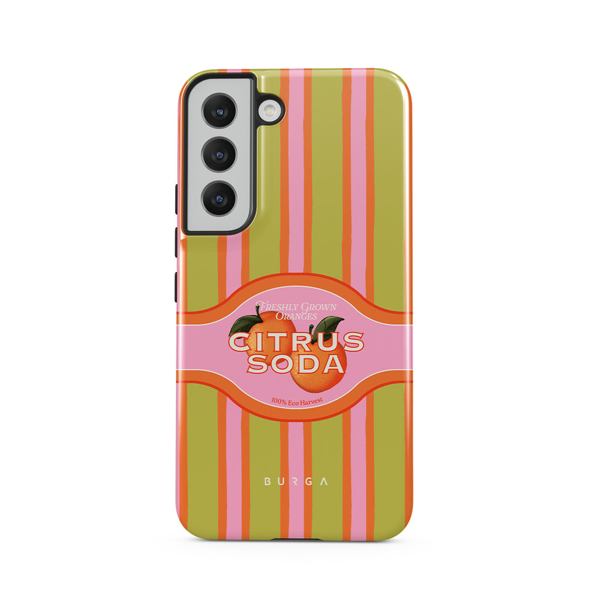 Este design contém: listras de citrinos vibrantes, texto, plantas cítricas, tangerinas, toranjas
