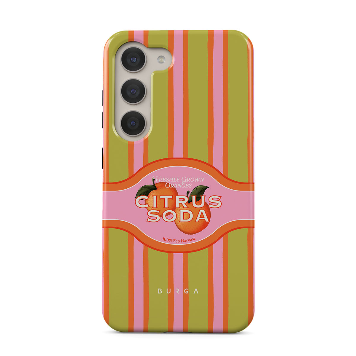 Este design contém: listras de citrinos vibrantes, texto, plantas cítricas, tangerinas, toranjas