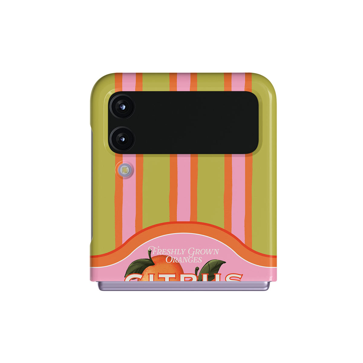 Este design contém: listras de citrinos vibrantes, texto, plantas cítricas, tangerinas, toranjas
