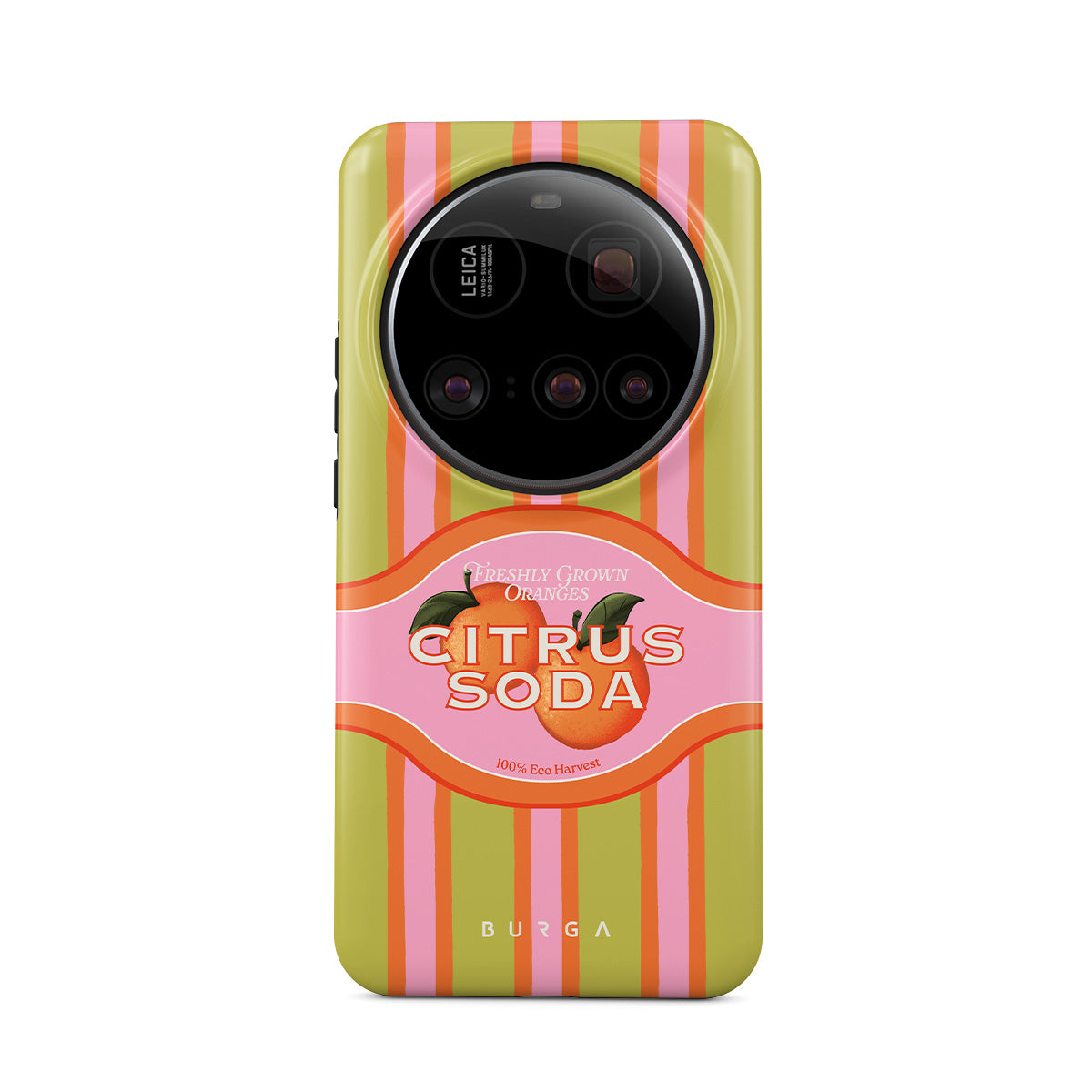 Este design contém: listras de citrinos vibrantes, texto, plantas cítricas, tangerinas, toranjas