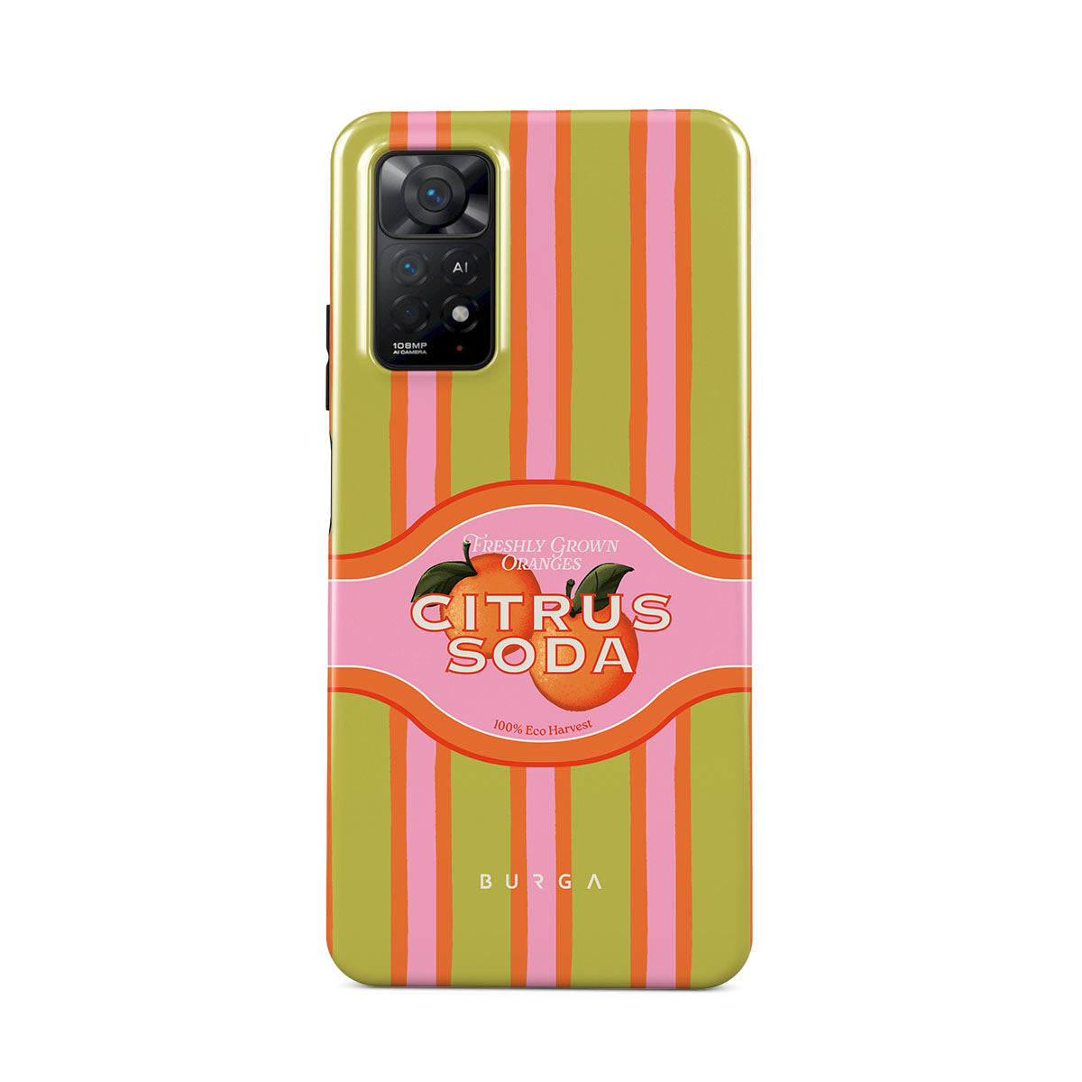 Este design contém: listras de citrinos vibrantes, texto, plantas cítricas, tangerinas, toranjas